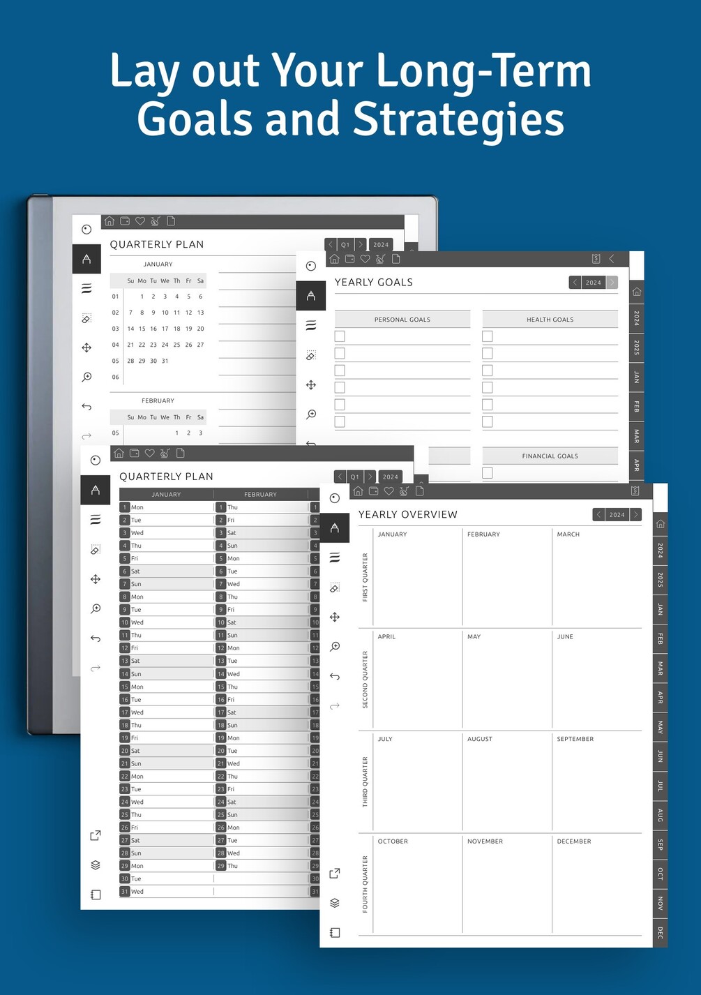 π Strategic Quarterly and Yearly Planning: Achieve your long-term goals with precision. Plan each quarter and year with 4 customizable pages, featuring over 40 templates, including Quarterly Focus, Yearly Plan, and Yearly Overview.