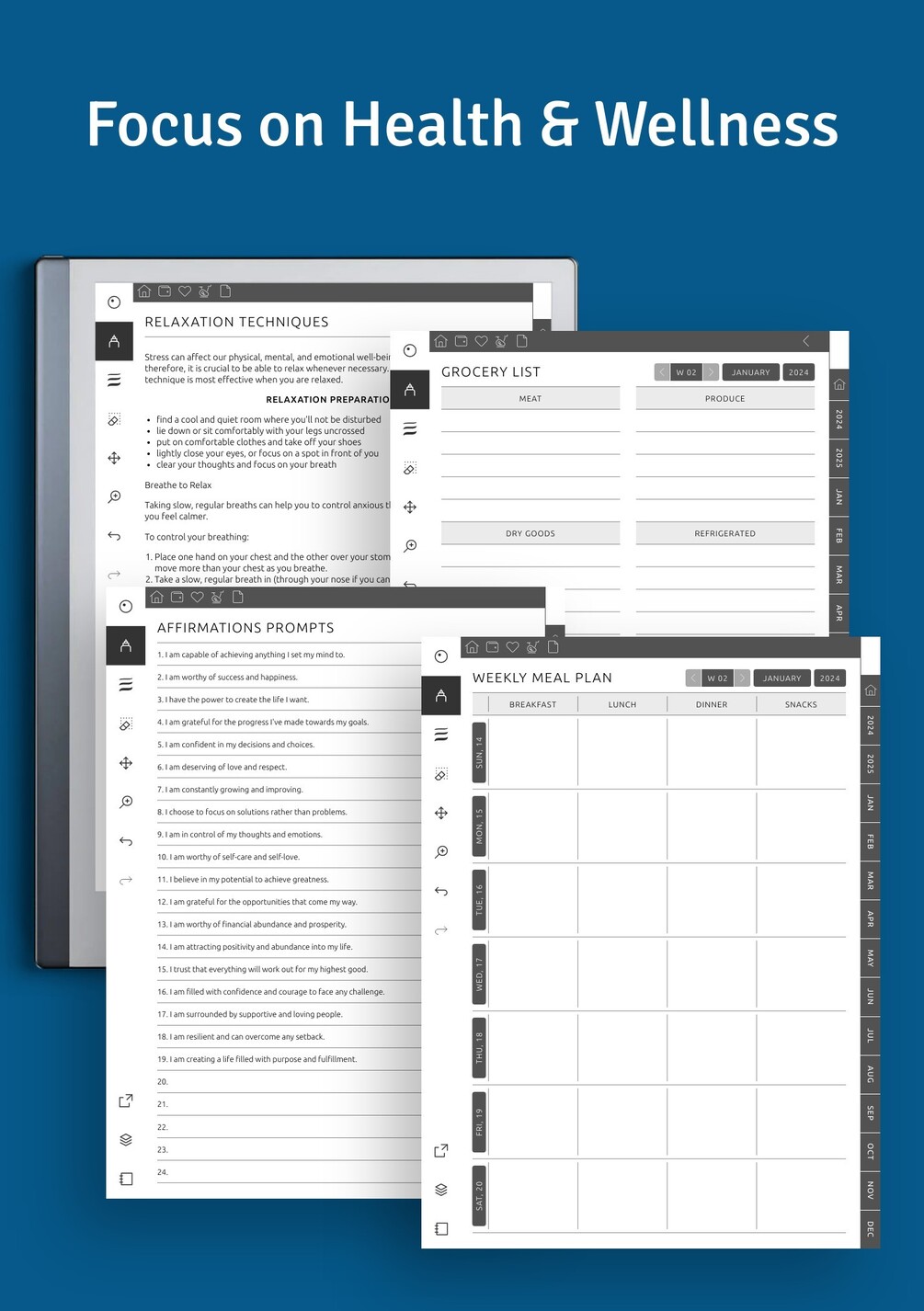 π Health & Wellness Focus: Build a balanced lifestyle with dedicated templates for meal planning, sleep tracking, and self-care checklists, ensuring your well-being remains a priority.